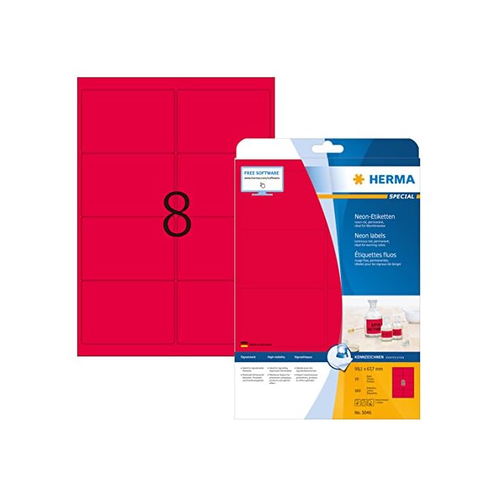 HERMA Self Adhesive Coloured Labels, 8 Labels Per A4 Sheet, 160 Labels For Printers, Neon-Red, 99.1 x 67.7 mm (5046)