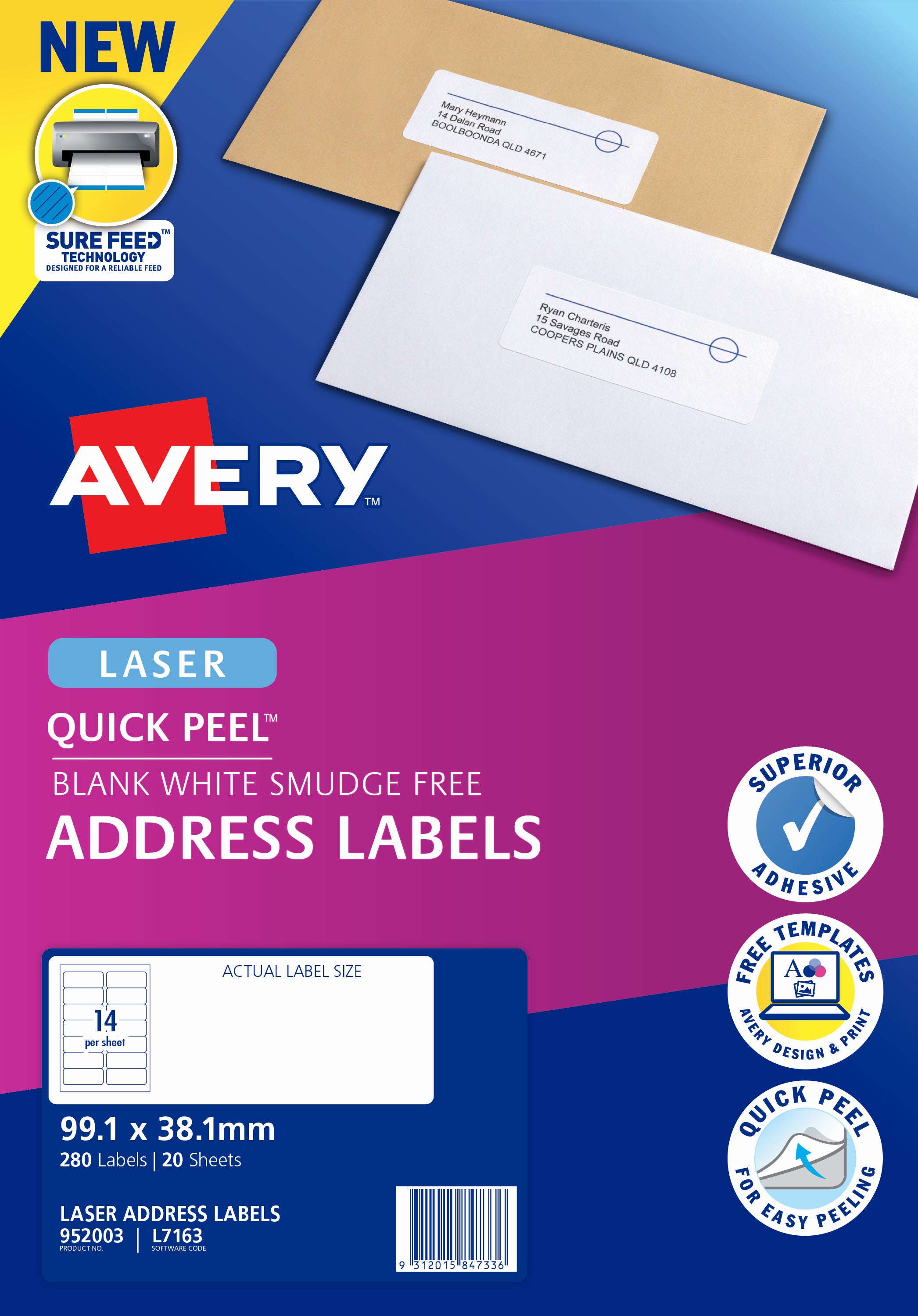 Etiquette adresse | L7163-100 - Avery Caractéristiques. Dimensions38,1 x 99,1 mm. Contenu1.400 Etiquettes / 100 Feuilles. ImpressionLaser. Code LogicielL7163. Type d'adhésifAdhésif permanent.